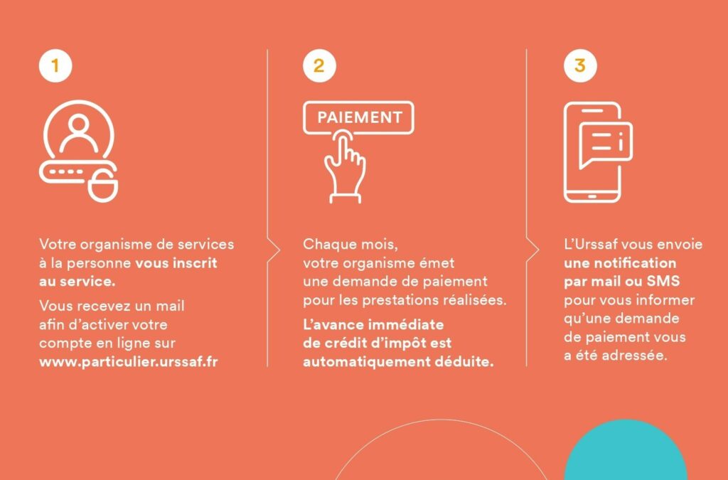 • Avance immédiate est un service optionnel et gratuit, proposé par l’Urssaf, qui permet la déduction immédiate de votre crédit d’impôt de 50% lors du paiement de votre facture à votre organisme prestataire de services. Concrètement, pour une dépense de 200 € de services à la personne, l’Urssaf ne prélèvera plus que les 100 € de reste à payer. Cuisine et Sourires répercutera donc cet allègement dans les factures qu’il vous soumettra.